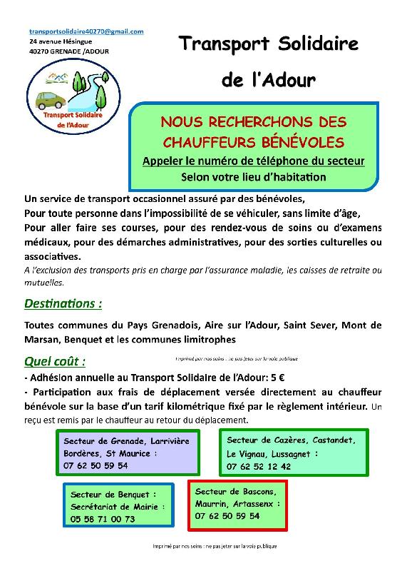 RECHERCHONS CHAUFFEURS BENEVOLES pour le TRANSPORT SOLIDAIRE de l'ADOUR
